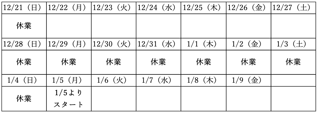なお、12月22日(月)~12月26日(金) は通常営業にてご注文を承りますが、出荷につきましては各運送会社の運